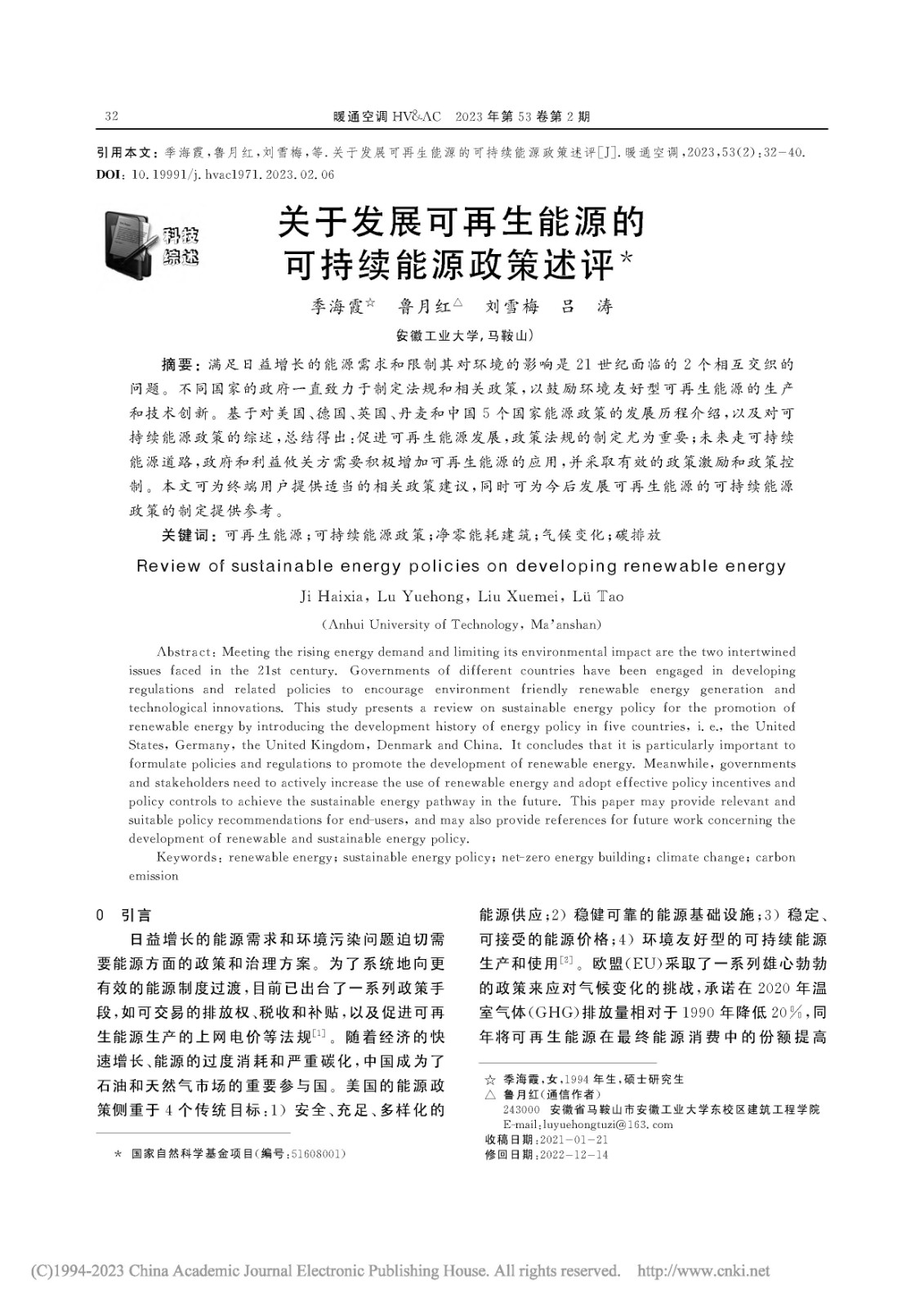 近日,安徽工业大学鲁月红副教授课题组发表的论文《关于发展可再生能源的可持续能源政策述评》荣获《暖通空调》杂志社2023年优秀论文。论文介绍了美国、德国、英国、丹麦和中国5个国家能源政策的发展历程,对可持续能源政策进行了综述,为终端用户提供适当的相关政策建议,并为今后发展可再生能源的可持续能源政策的制定提供参考。